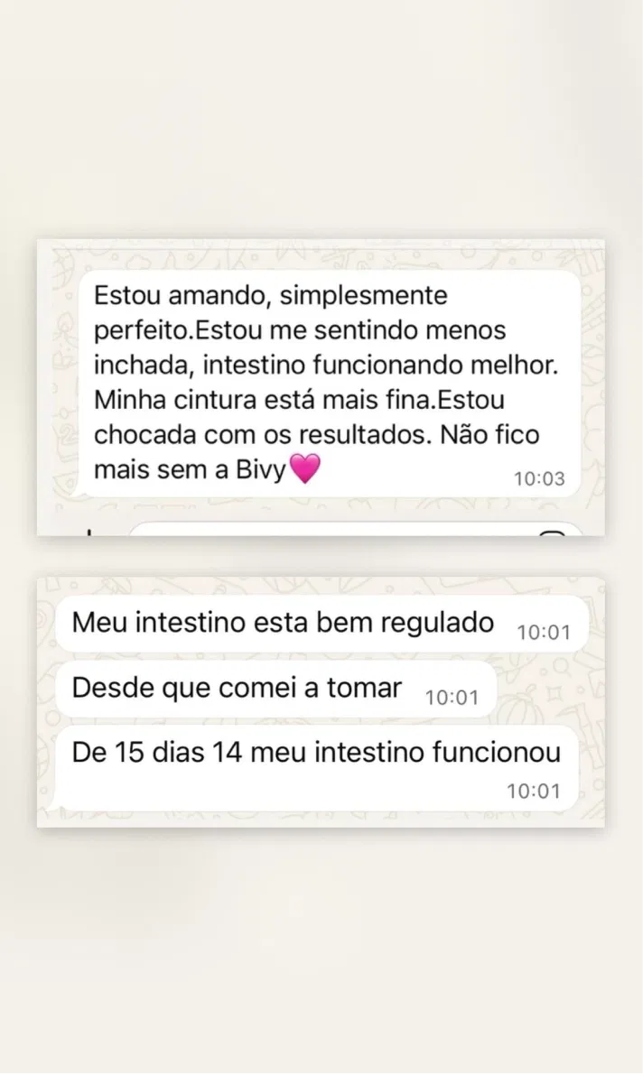 O que começou como uma curiosidade virou um estilo de vida. Você não quer mais viver sem esse cuidado. A pele está mais viçosa, o intestino em harmonia, a sensação de leveza virou padrão e você sente que, finalmente, está no controle do seu corpo. E vai querer cada vez mais tomar Bivy.
