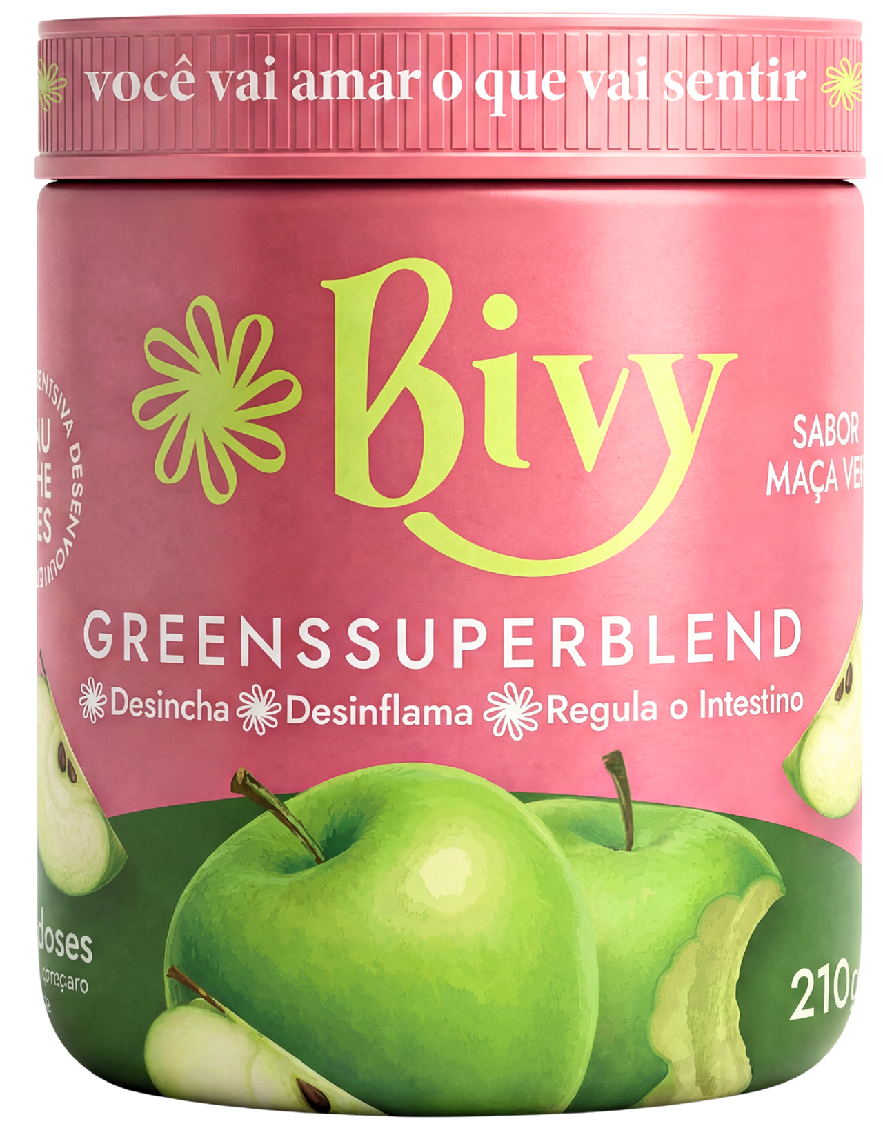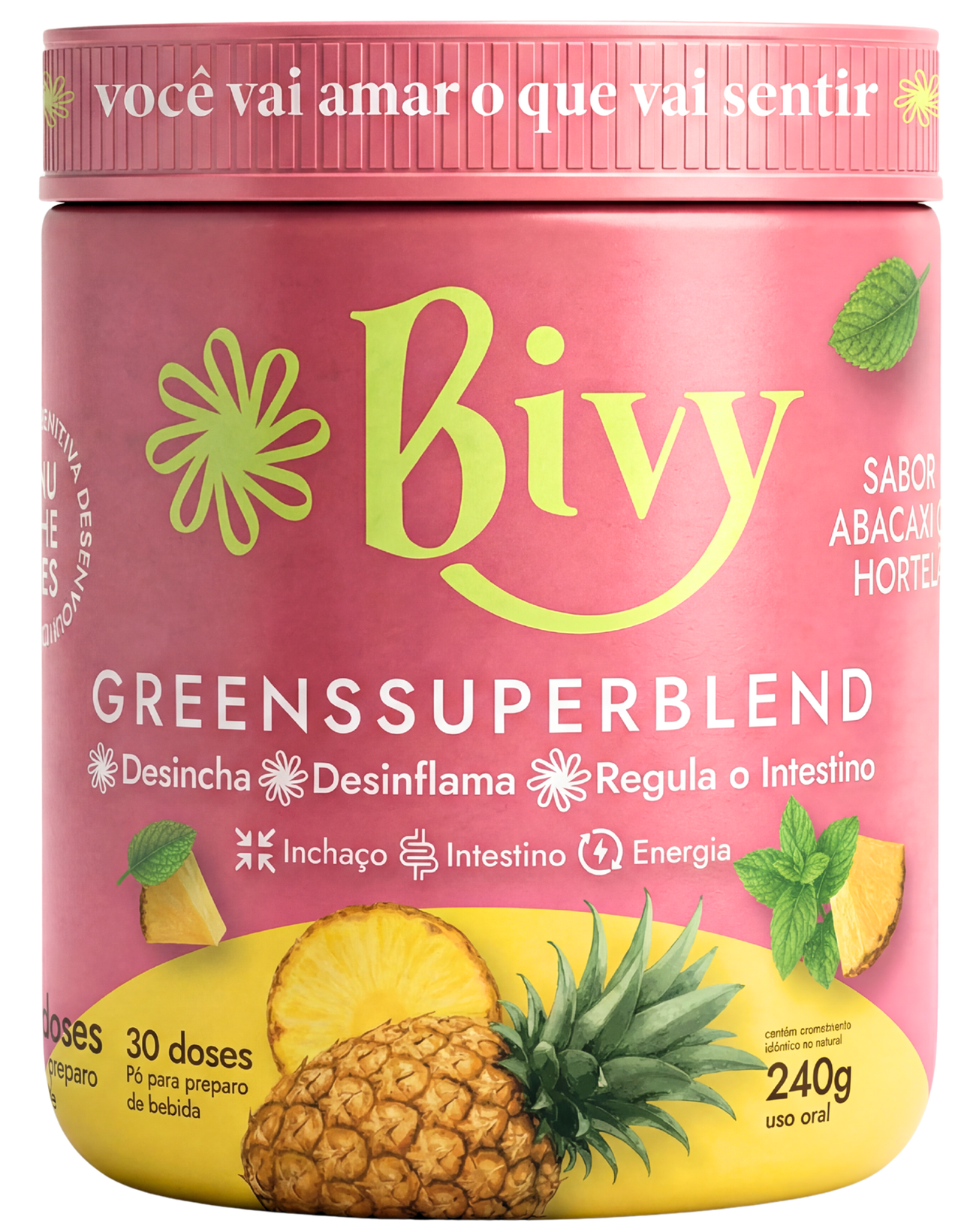 A Bivy é um superblend verde em pó, sabor melancia com limão, com 42 ingredientes ativos entre superfoods, fibras, vitaminas e minerais. Criada para mulheres que querem desinchar, regular o intestino, reduzir a inflamação e se sentir mais leves e confiantes, tudo isso com um sabor delicioso e sem gosto de mato.